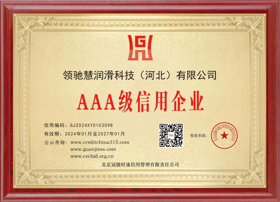 近日,領馳慧潤滑科技(河北)有限公司迎來一個好消息,公司獲得了AAA信用企業(yè)認證的榮譽,此信用等級評定遵循客觀公正、科學規(guī)范的原則,對企業(yè)進行綜合評定。